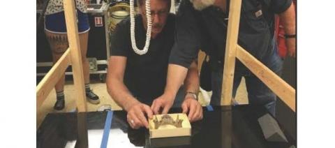 Figure 1. Jerry and Bill Positioning a Mandible from the Arch Street Project for X-Ray Imaging.