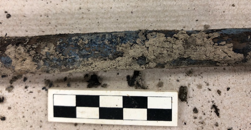 A couple of weeks ago the volunteers cleaning remains, led by Kim Eberle-Wang, in the summer Mutter pop-up lab made an interesting discovery – mysterious blue markings on some of the bones they were cleaning from G-260. What could it be? Was it intentional? Was it some sort of strange mold? Thanks to the sleuthing skills of Dr. Allison Grunwald, our blue substance was determined to be vivianite. The damp, iron-rich soil of 218 Arch Street provided the perfect condition for this mineral to form due to an interaction with the phosphate present in human bone. Apparently, it’s quite a common occurrence. The crystals that form turn blue when exposed to oxygen. As pretty as it is, vivianite can cause problems for DNA analysis.