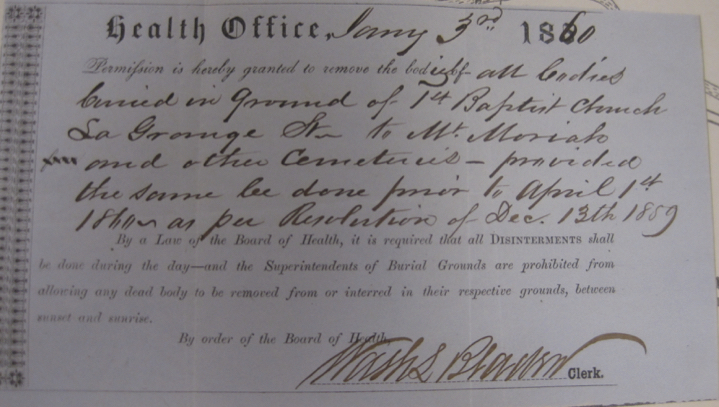 Whatever the reason for delay, the ultimate decision to announce its intention at a public meeting on November 21, 1859 is not yet clear.[2] Nor is there any reason yet available for the Church’s acceptance of the tight window they received when seeking permission to commence with the relocation one month later. On December 13, 1859, the Board of Health gave the trustees permission “to administer the remains of the Dead in the Burial Ground La Grange Place upon the payment of Fifty Dollars provided that the same be done under the direction of this Board and provided further that this Permit Shall not extend beyond the First day of April 1860.”[3] We do not yet know why so short a time was given, but investigations into the relationship between the church and the Board of Health are underway. Whatever the reason, church officials agreed and on January 3, 1860, the trustees received a work permit, leaving just under three months to move what current estimates suggest could be anywhere from 2,000 to 2,500 individuals to the new site purchased: Lot 112, in Mount Moriah Cemetery.