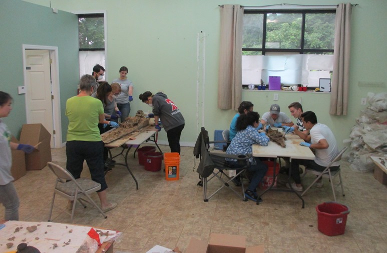 Coffin excavation lasted all summer and into the fall of 2017.  Still the WT was the perfect location to bring students, host visitors and reporters…”just look for the building with the dogs,” I would tell people.  As the coffins were excavated, the focus of the work at the WT became cleaning the remains, the next step in the lengthy process before analysis can begin.  Again the WT was the perfect place where we could set up drying racks, wash indoors or outside when the weather was nice.