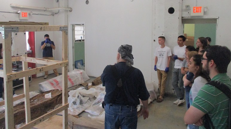 Back in March of 2017 when coffins were being excavated from the First Baptist Church’s cemetery on 218 Arch Street, we had a problem:  where to put the coffins.  At the time, the property developer took them from the site and stored them in shipping containers.  But this was not a long-term solution.  Neither could we internally excavate the remains in that sort of facility.  After a few false starts, a solution emerged:  Rutgers-Camden would provide funding for an off-campus warehouse from June until December 2017.  During that time, we would run a summer program to excavate the coffins and incorporate the analysis of the remains into our classes as much as possible.