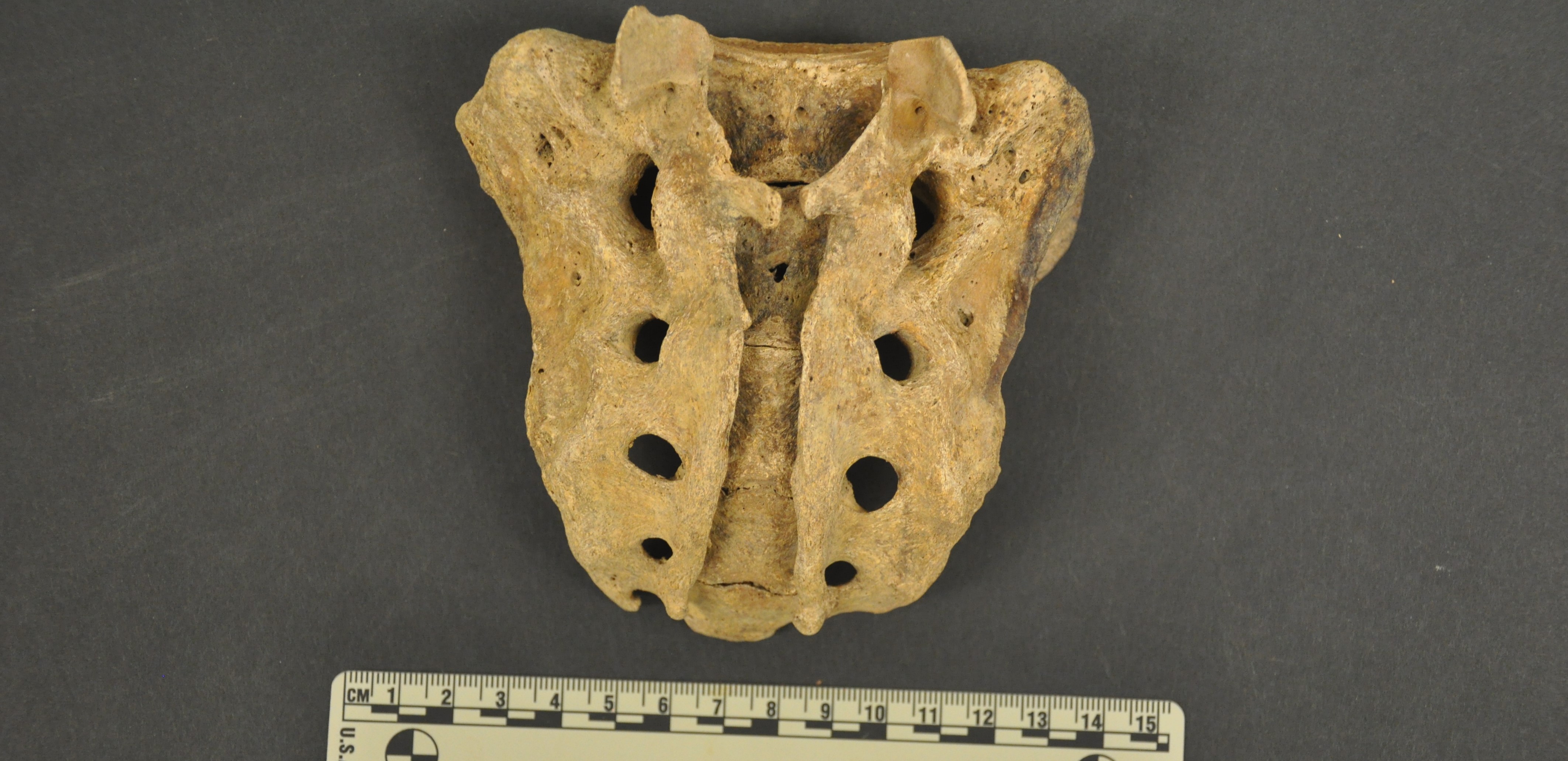 In at least two of the individuals from Arch Street whose remains are housed at Rutgers University-Camden, we can see evidence of mild and moderate spina bifida in the sacrum. The sacrum is the bone just below the vertebral or spinal column (colloquially known as “the spine”), located in the center of the back part of the pelvis. A modern human typically has five sacral vertebrae that fuse during adolescence to form a single, triangular bone. When the vertebral arches along the back of the sacrum are not fully closed, they are considered to show evidence of spina bifida. The bone appears to flare out along a vertical line from the center of the sacrum, leaving a visible gap where the lowest part of the spinal cord (technically, the “cauda equina" or “horse’s tail”, a bundle of spinal nerves as opposed to a more compact spinal cord that runs through most of the vertebral column before thinning out into this bundle of nerve fibers) would have then been exposed. The severity varies, from just one segment of the sacrum not being fully closed, to the entire back of the sacrum being open in this manner. We can observe this variation in severity in two individuals from Arch Street with one exhibiting very mild spina bifida, and the other one (pictured in this post) showing fully open neural arches along the entire length of the sacrum.